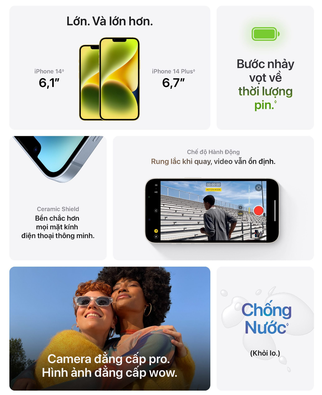 iPhone 14. Với hệ thống camera kép tiên tiến nhất từng có trên iPhone. Chụp những bức ảnh tuyệt đẹp trong điều kiện từ thiếu sáng đến dư sáng. Phát hiện Va Chạm,1 một tính năng an toàn mới, thay bạn gọi trợ giúp khi cần kíp.