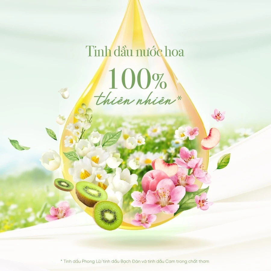– Tinh dầu 100% thiên nhiên*, hương hoa cỏ và trái cây cao cấp.
