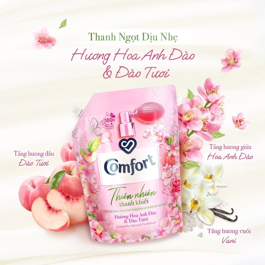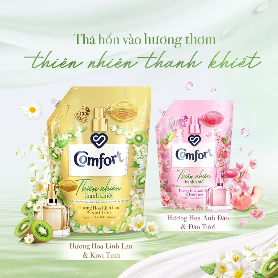 Nước xả làm mềm vải Comfort Thiên Nhiên Thanh Khiết chính là lựa chọn hoàn hảo cho những ai yêu thích hương thơm nhẹ nhàng, thanh dịu và không nồng gắt trên áo quần. Với tinh dầu nước hoa 100% thiên nhiên* được chưng cất tỉ mỉ, Comfort mang đến hương thơm lấy cảm hứng từ hoa tươi và trái cây mọng nước, tỏa hương tươi mát trong lành, không nồng gắt và bền lâu trên quần áo suốt 100 giờ^.