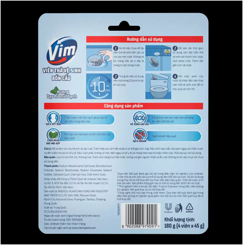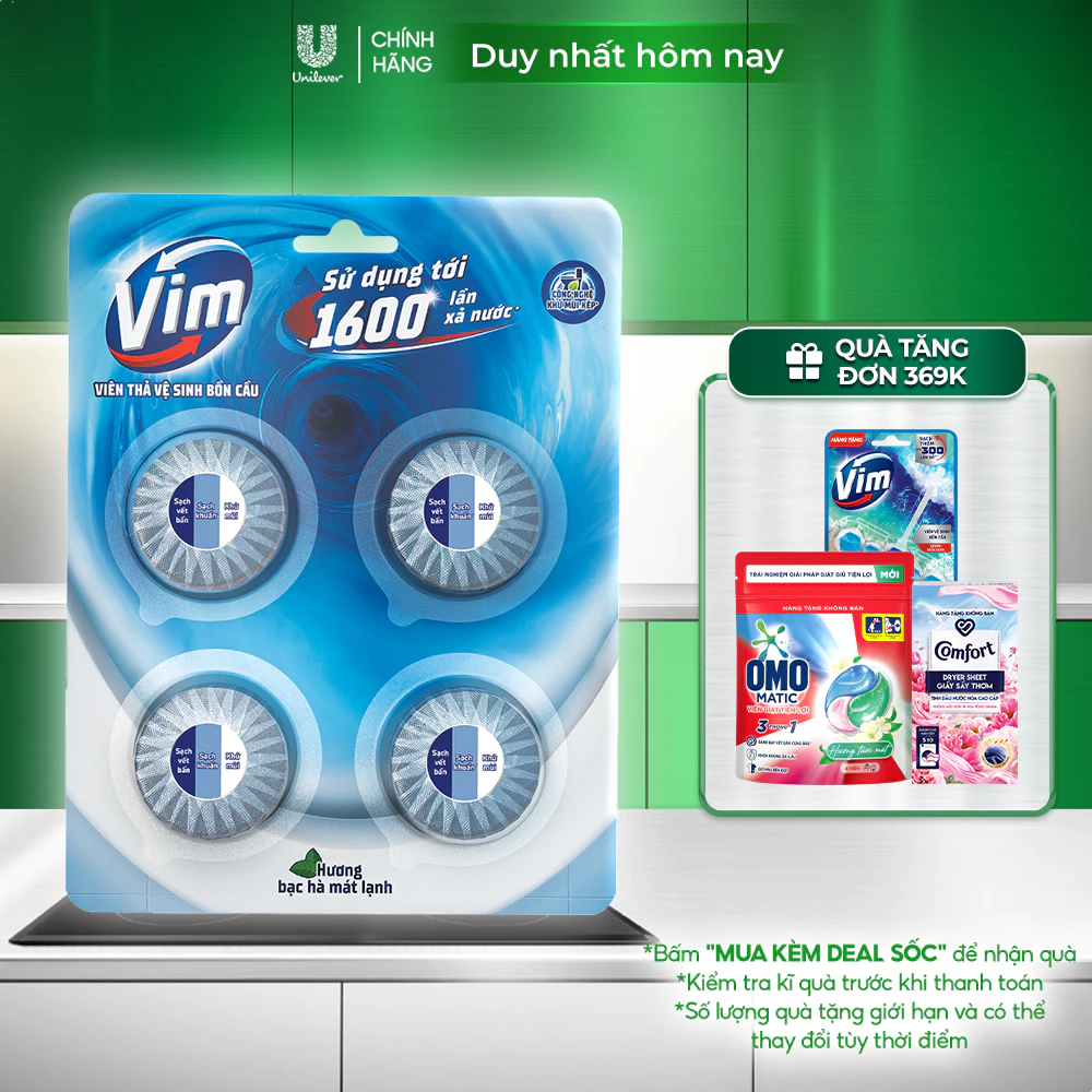 Viên thả vệ sinh bồn cầu Vim với công nghệ khử mùi kép, giúp đánh bay mùi hôi với hương bạc hà mát lạnh trong mỗi lần xả. Sản phẩm hòa tan vào dòng nước, hiệu quả sử dụng lên đến 400 lần xả*, giữ cho bồn cầu sạch khuẩn và sáng bóng dài lâu.